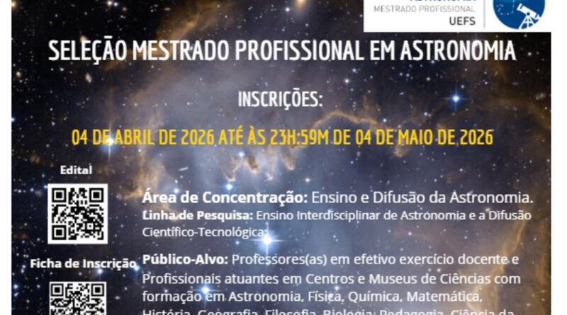 Read MoreO Mestrado Profissional em Astronomia da Universidade Estadual de Feira de Santana (MPAstro-Uefs) está com inscrições abertas para a Seleção